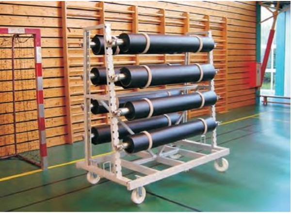 Le stockeur est équipé de roulettes larges, adaptées aux sols sportifs et aux déplacements à l’intérieur d’un gymnase ou d’un local technique.